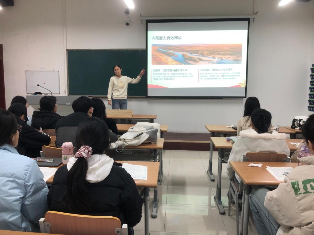 杨颖院长从新质生产力、内需扩容、深化改革、统筹安全四个维度展开讲解,系统阐释中国经济高质量发展的战略路径。她指出,当前经济结构转型期既是挑战也是机遇,毕业生需主动对接国家战略方向——在科技创新领域深耕专业能力,在服务业扩容中挖掘职业空间,在数字经济浪潮中提升跨界技能,才能在就业市场中脱颖而出。