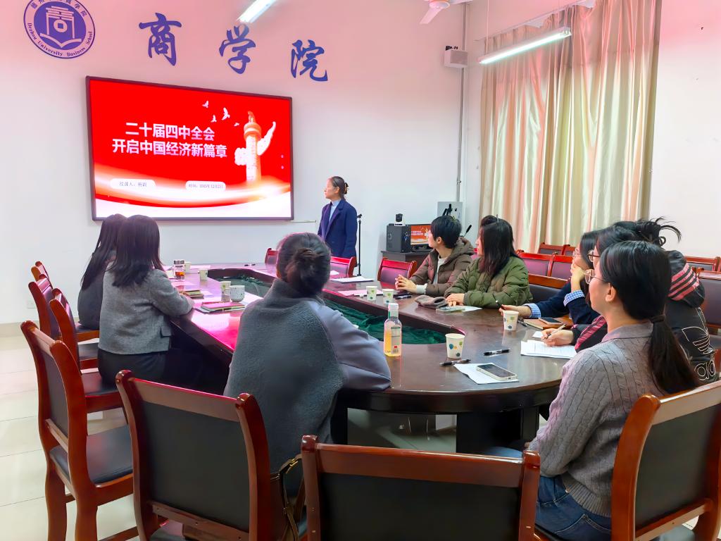 2025年12月1日,商学院党委副书记、院长杨颖面向第一教师党支部全体党员讲授专题党课,以“党的二十届四中全会开启中国经济新篇章”为主题,深入解读全会关于“十五五”规划的核心部署,引导党员教师把握经济发展方向,将全会精神融入教育教学与科研实践。