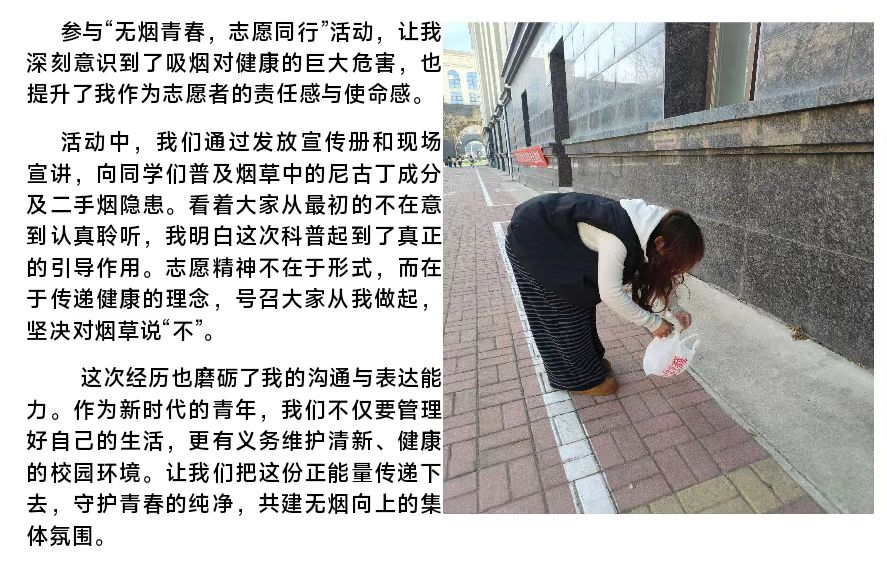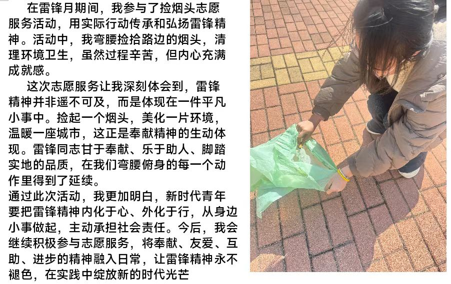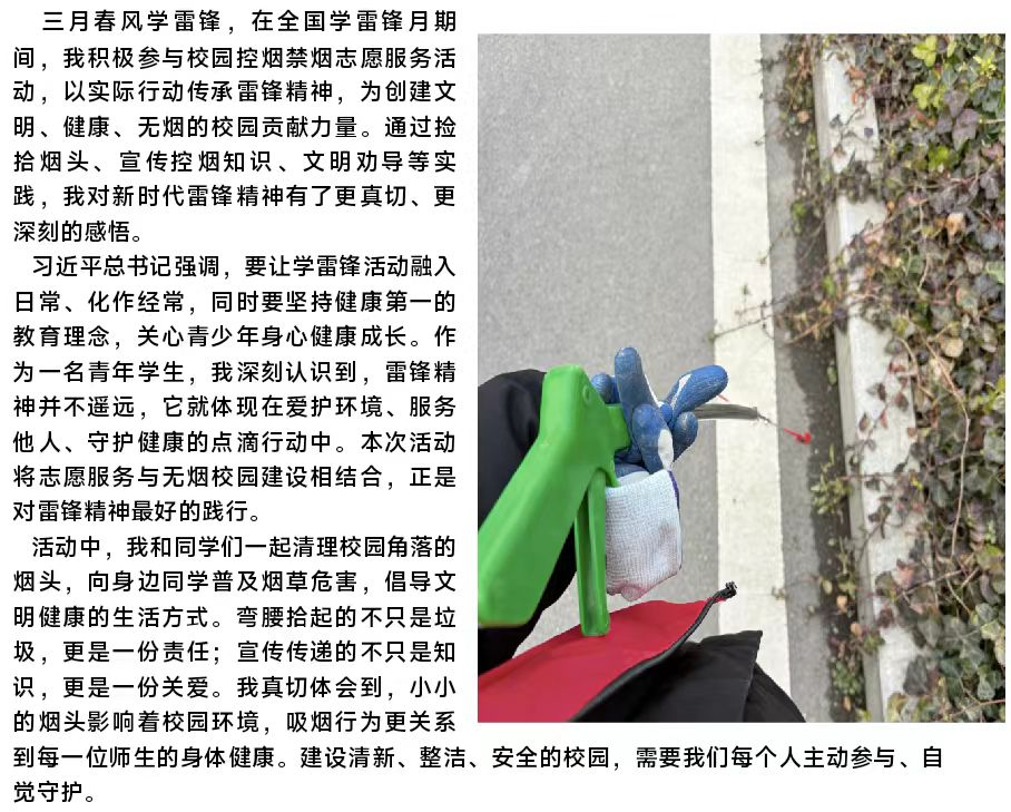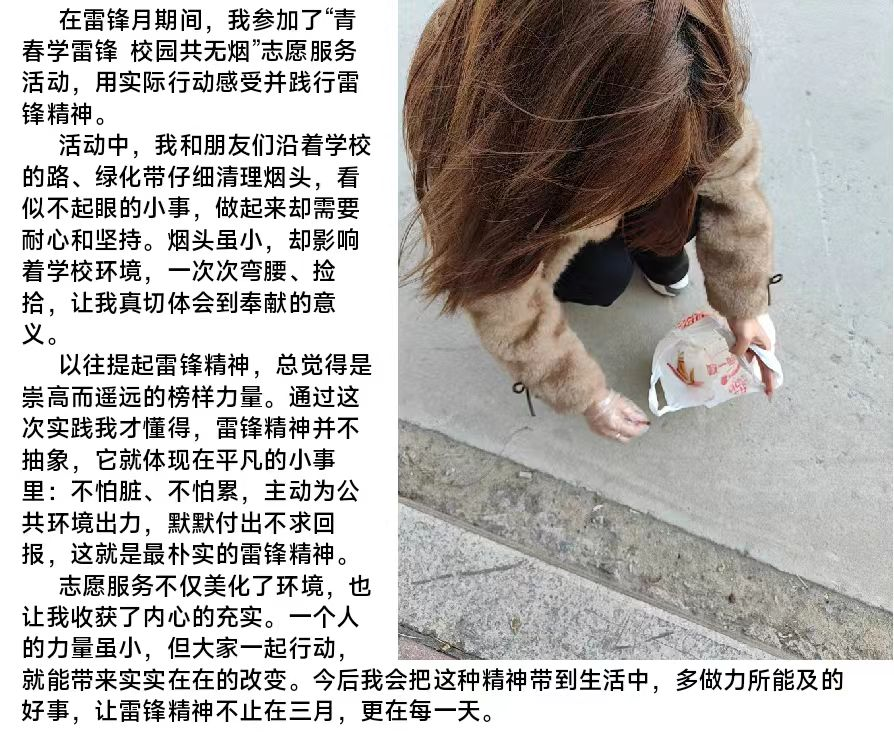 活动前期,各班班长、团支书通过班级群广泛动员,面向全院学生发起禁烟控烟志愿服务号召。志愿者们在校园全域开展烟头清理行动,结合服务经历撰写雷锋精神感悟。活动后期,商学院从征集的作品中评选出优秀作品,在学院内部进行展示。