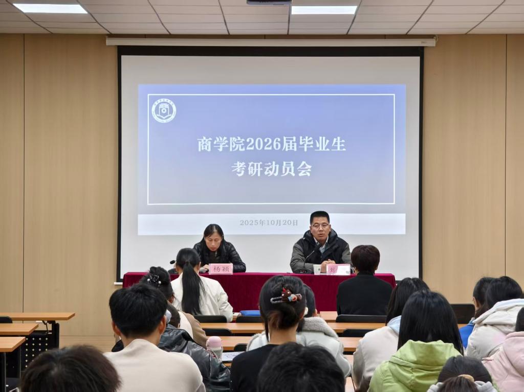 为帮助毕业生明确考研方向、缓解焦虑情绪,进一步提高备考的科学性与有效性,10月15日,商学院于明理楼0157报告厅举办2026届毕业生考研动员会,学院院长杨颖、党委副书记刘金亮、毕业生辅导员刘爱敏、张莹及150余名考研毕业生参加。