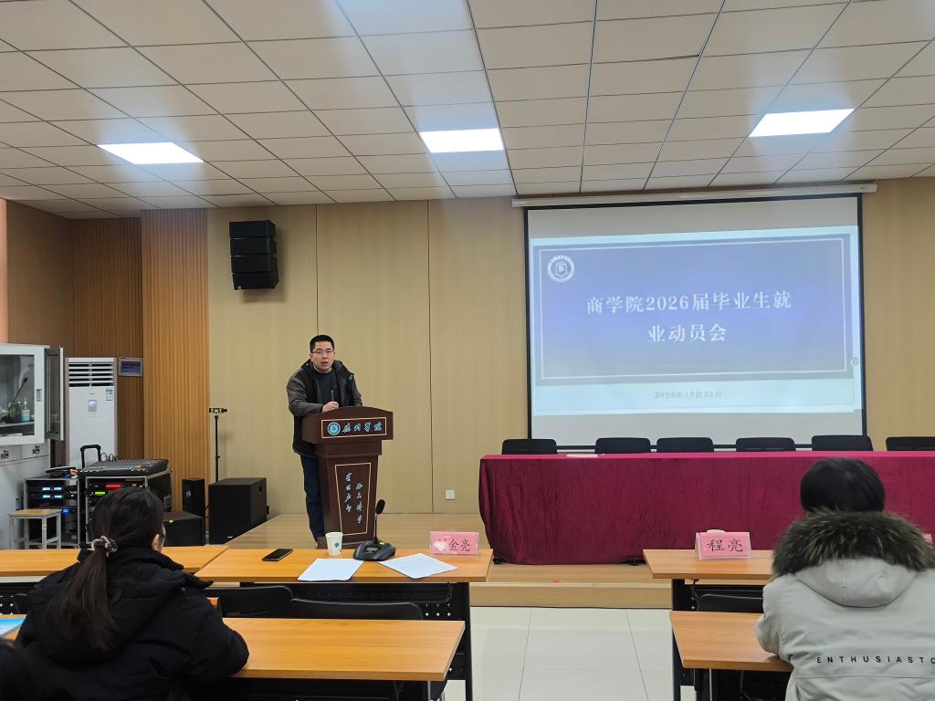 为做好2026届预毕业生就业服务,明晰职业路径、提升竞争力,12月22日,商学院在明理楼0157报告厅召开2026届预毕业生就业动员会,党委书记孙晨晨、党委副书记刘金亮及毕业班班主任出席,100余名预毕业生参加。