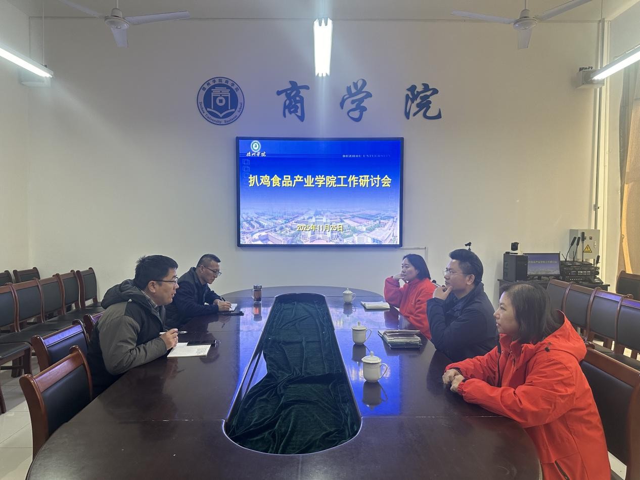 2025年11月25日德州扒鸡食品产业学院在明理楼0359会议室召开工作推进会。德州扒鸡集团营销总监和人力资源总监,商学院党委副书记、副院长参加了会议。