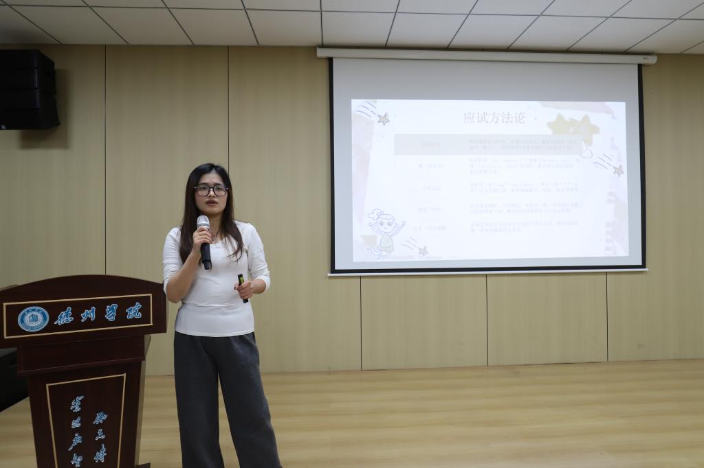 讲座现场,梁文琪紧扣近年四六级命题趋势,以“考点拆解+技巧落地”为主线展开分享。在听力模块,她结合2024-2025年真题案例,演示“预读选项锁定核心信息、语流中捕捉逻辑信号词”的应试方法,点明“同义替换”“语气转折”等高频设题点,帮助同学突破“听辨低效”的备考困境;针对阅读板块,她解析了仔细阅读的“文章结构分层法”与长篇阅读的“定位词速查策略”,通过对比不同题型的命题逻辑,指导同学建立“先题后文、精准定位”的解题节奏,有效提升长难文章的处理效率。